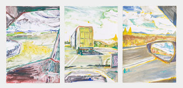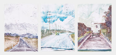 This series of monotypes is an expression of my oft-repeated return trips between the coastal town of Pambula where I live and the city of Canberra. The long narrow gallery space was intended to reflect temporal and spatial aspects of the journey while each of the seven triptychs expressed other aspects of my journey.